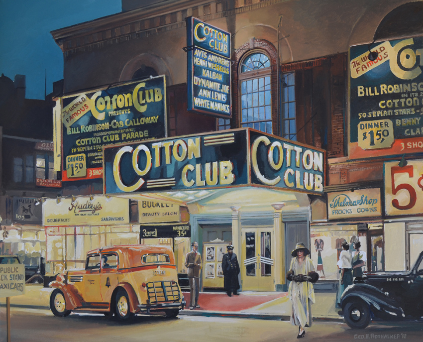The original Cotton Club in Harlem was built and operated until the early 1930s. The building in the painting is the Club's location at 48th Street and Broadway.The Latin Quarter later opened in its space. The building was torn down in 1989 to make way for a hotel. A new club named Cotton Club, opened in 1978 at 656 West 125th Street. It remains as a tribute to the great musicians of the past, but is today enjoyed by people of all races and cultures,